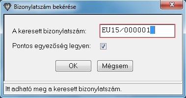 Működése a következő, először is bekéri a program a keresett tétel bizonylatszámát, itt ha nem pontos az sem okoz bajt, mert lehetőség pontos egyezőségre való keresés és ezt ki tudjuk kapcsolni.