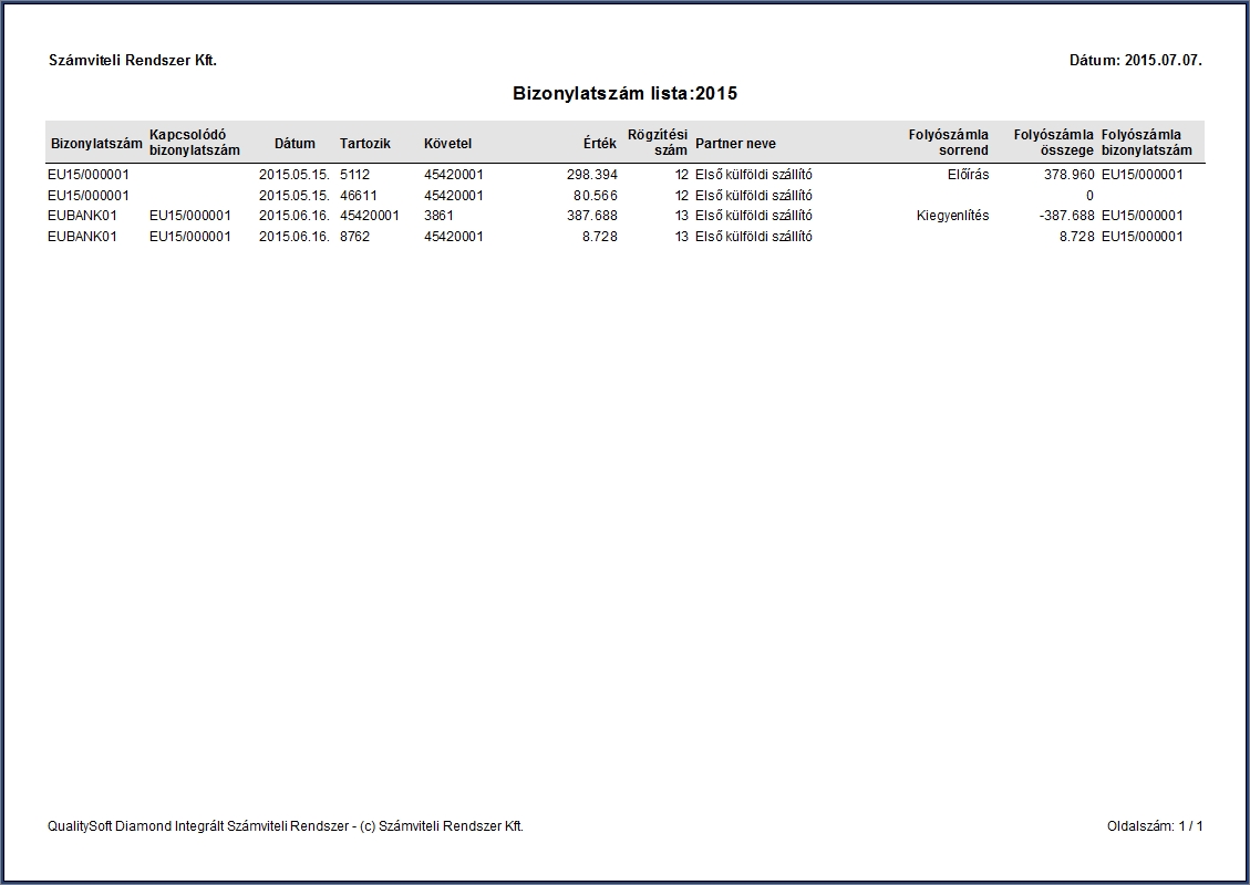 Ez a lista arra használható, ha csak egy könyvelt tételt vagy csak adott bizonylat számhoz tartozó tételek szeretnénk kinyomtatni és tudjuk a bizonylatszámukat akkor azt itt megadva kitudjuk nyomtatni, PDFfile-t készíthetünk róla vagy excel táblázatba menthetjük.
