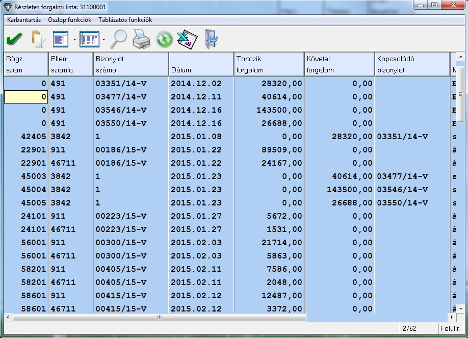 Ezen a listán a kiválasztott számlaszám Havi forgalmak , vagy Részletes forgalmak oszlopának „Táblázat” szövegén ENTER-t ütve azonnal kilistázható az adott számlaszám forgalma Havi, vagy tételes bontásban (valamint ha deviza modullal rendelkező programban kéri le akkor devizában vagy forintban is le kérhető!), és az eredmény egy újabb táblázatban jelenik meg tartozik - követel záró egyenleggel, havi, valamint éves egyenleggel. A listák az F10 billentyűvel ki is nyomtathatók, vagy forgalmi grafikon is kérhető.
