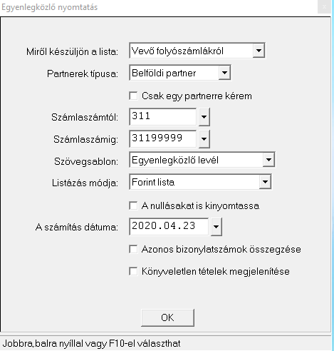 Az előugró ablakban kiválaszthatjuk, hogy, vevő, vagy szállító, illetve, hogy belföldi vagy, külföldi partner egyenleg információkat szeretnénk listázni. Ha konkrétan egy partnerre szeretnénk rákeresni, akkor a jelölő négyzetet bepipálva megtehetjük, illetve meg lehet adni bizonyos intervallumot is. Több partner lekérése esetén olyan listát kapunk, ahol minden partner egyenlege külön lapon szerepel. Tovább lehet szűrni aszerint is, hogy forint, vagy deviza listát szeretnénk-e látni.
