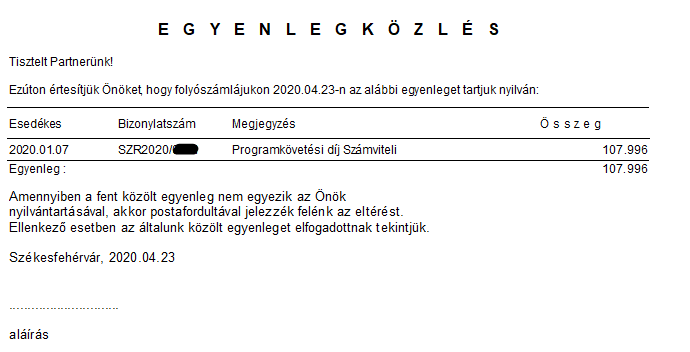 Ebben a menüpontban a vevői kiegyenlítetlen bizonylatokról tájékoztató jellegű egyenlegközlés formájú nyomtatást kapunk, amit ki lehet küldeni a vevőknek, hogy tudják hogyan is állnak pénzügyileg a céggel szemben. Szerepel rajta a nyitott összeg, az eredeti összeg, és az esedékesség lejáratának napja.