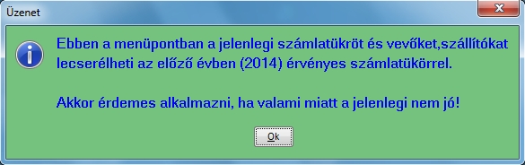 A számlatükör átvételét a Zárás-Nyitás / Év nyitás funkciók / Előző év számlatükrének átvétele menüpontban tehetjük meg. A menüpont elindítása után figyelmeztet a program több lépcsőben minket az elvégzendő folyamat mit módosít. Ezeket az üzeneteket ha folyamatot ténylegesen végre akarjuk hajtani le kell "OK"-ézni.