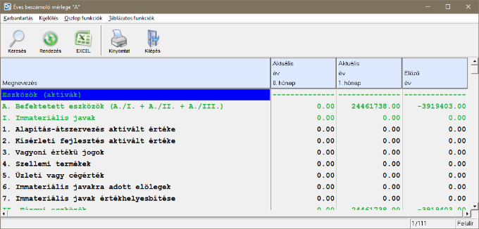 A "Zárás-nyitás" menüponton belül többféle kimutatás lekérhető. Ezek többségénél elérhető a havi bontású táblázat. Viszont a mutatószámoknál, valamint a KATA, KIVA, HIPA és áfa bevallásoknál jelenleg nincs ilyen lehetőség. Az éves beszámoló mérlege 'A' menüponton keresztül mutatjuk be a havi bontású táblázat lekérdezését. A "Listázás típusa" mezőben a "Havi bontású táblázat" elemet kell kiválasztani ehhez a funkcióhoz.