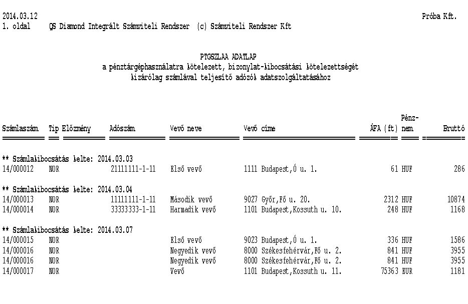 A funkció a Bizonylat/Bizonylat kimutatások/PTGSZLAA lista, bevallás menüpontból érhető el.