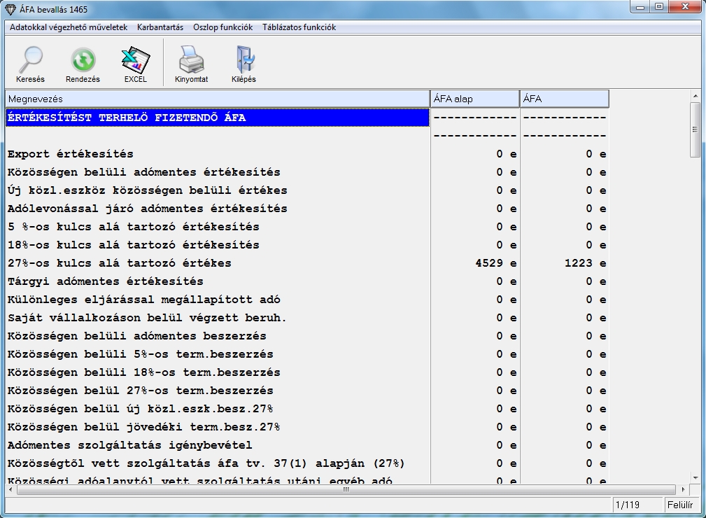 Ha a listázás típusának táblázatot adunk meg, akkor a program egy táblázatban készíti el a bevallást és az itt megjelenő adatok módosíthatóak így könnyedén tudjuk javítani a program által kigyűjtött adatokat ha nem egyeznek. A táblázatból kilépve a módosított adatokat adja át a programunk az ÁNYK-nak.