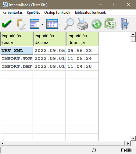Az OK gomb megnyomása után a program kigyűjti a kiválasztott típusú importálásokat, és megjeleníti őket egy táblázatban, amiben látható az importálás típusa, dátuma és időpontja.