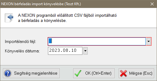 Az importálás megkezdéséhez ki kell választani a kívánt CSV állományt, és meg kell adni azt a napot, amelyikre a rendszer lekönyvelje a bérfeladást (a CSV állományban nem szerepel a dátum).