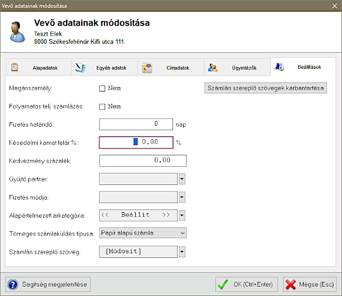 Lehetőségünk van vevőnként más és más késedelmi kamatot beállítani.
