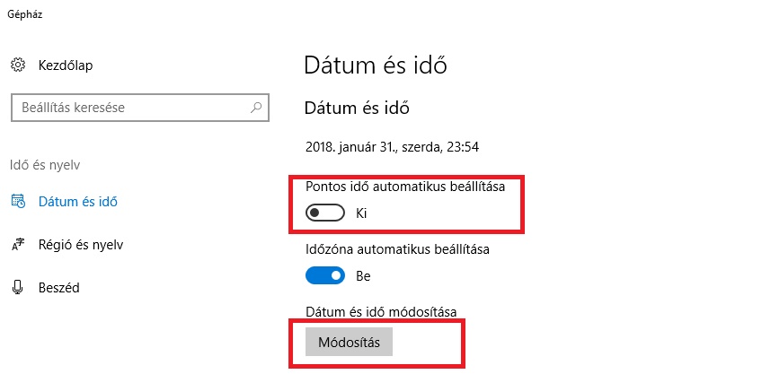 Itt még ki kell kapcsolni a "Pontos idő automatikus beállítása" gombot mert a dátum módosítása gomb csak eekkor lesz aktív válassza ki a módosítás gombot és írja át a dátumot. A Pontos idő automatikus beállítása gombot ne állítsa vissza mert akkor visszaáll a dátum.
