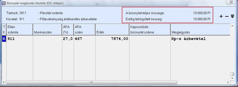 Amennyiben a felső táblázatban megadtuk a bizonylat teljes összegét, akkor az érték mezőben mindig a már felrögzített összeg és a teljes összeg különbözete felajánlásra kerül, de átírható.