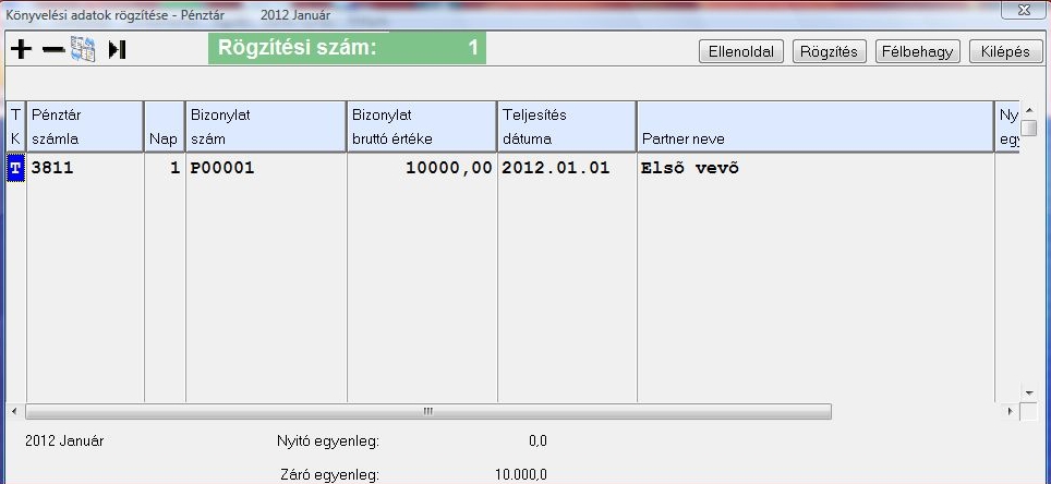 A könyvelési ablak fejrészben tudjuk legelőször megadni azt hogy a pénztár főszámla a tartozik vagy követel oldalára szeretnénk az első tételt rögzíteni, majd ezután beírhatjuk a bizonylatszámot, a könyvet hónapon belüli napot és a teljesítés dátumát. A partner neve mezőben kézzel beírhatjuk a partner nevet, illetve F10-el vagy a lenyíló ikonra kattintva válogathat a vevők vagy szállítók közül. A partner neve mező kitöltése nem kötelező, azonban, ha kitöltjük, akkor pénztárbizonylat nyomtatásakor rákerül a pénztárbizonylatra a partnernév. Továbbá ha a partnert adatbázisból választjuk (akár a 102-es rendszerparaméterrel elérhető készpénzes partner törzsből is; ld.: Készpénzes partnerek karbantartása), és a partnernek meg van adva az adószáma, akkor a tételhez automatikusan berögzül az adószám, ami az értékhatár feletti áfás kimutatás működése szempontjából elengedhetetlen.