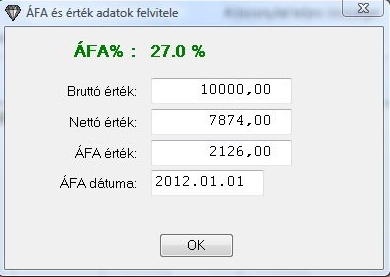 Ezután az érték megadó ablakba jutunk ahol beírhatjuk a tétel bruttó, illetve nettó és áfa összegét. A bruttóból a nettó automatikusan kiszámítódik. Amennyiben a bruttót nullán hagyjuk és a nettó értéket adjuk meg akkor abból a bruttó és az áfa visszaszámolódik.