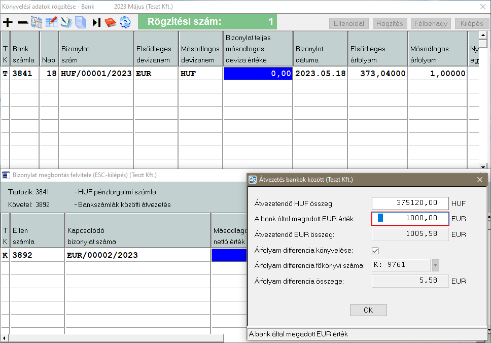 A könyvelési képernyőn az átvezetés bevételi részének könyvelésekor a másodlagos devizanemhez meg kell adni a HUF-ot. Az alsó táblázatban az ellenszámlánál az alapadatokban megadott banki átvezetés számnak kell lennie, és be kell írni egy kapcsolódó bizonylatszámot (azt a bizonylatszámot, ami az átvezetési kiadás részéé). Ezután a "Másodlagos deviza nettó érték" mezőn enterezve megjelenik egy ablak. Itt az "Átvezetendő HUF összeghez" meg kell adni a HUF banki kivonaton szereplő HUF összeget (375.120HUF), és a "Bank által megadott EUR érték" mezőben azt az EUR összeget, ami átvezetésre került az EUR bankszámláról (1.000EUR). A rendszer kiszámítja a fejben szereplő elsődleges árfolyam (373,04) alapján az 1005,58EUR-t (375.120HUF * (1,00 / 373,04)), és a két EUR összeg különbözetéből számol egy árfolyam különbözetet EUR-ban. Ezt le is fogja rögzíteni, és ilyen módon nem marad egyenlege EUR-ban a 3892-nek. Annak érdekében, hogy HUF-ban se maradjon egyenlege a 3892-nek, a "Másodlagos deviza nettó érték" mezőn enterezve megjelenő ablak kikeresi a könyvelésben a kapcsolódó bizonylatban megadott banki tételt, és annak az árfolyamát fogja használni az éppen könyvelt 3841-es bank elsődleges árfolyamaként. Így az árfolyam differencia sorban a HUF összeg is megjelenik, és kifut a 3892 nullára.