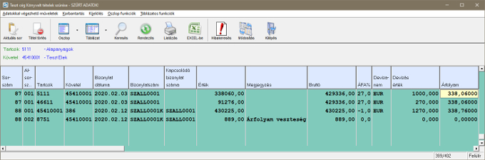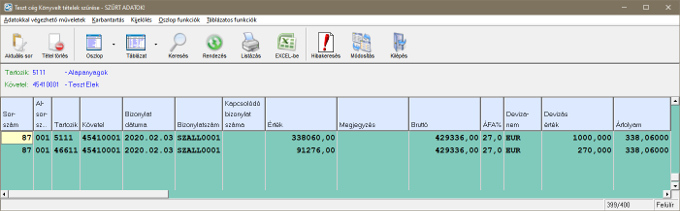 A szükséges adatok megadása után rögzíthető a tétel. Rögzítés után a könyvelt tételek szűrésénél ellenőrizhető a bizonylat: