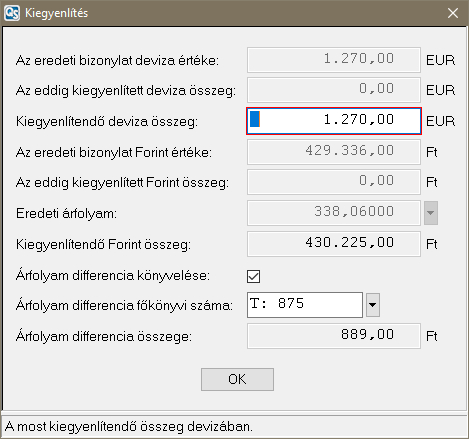 Ebben az ablakban állítható be, hogy könyvelje-e a program az árfolyam különbözetet vagy sem. Emellett például látható az ablakon a kiegyenlítendő tétel összege (ami át is írható, ha rész kiegyenlítésről van szó), az árfolyamkülönbözet összege, valamint az eredeti árfolyam is. Az "Árfolyam differencia főkönyvi száma" mezőben megadható, hogy melyik főkönyvi számra könyvelje a rendszer az árfolyam különbözetet. Ezt az adatot a rendszer az alapadatok menüpont alapján ajánlja fel. Ha meg van adva a "Banki árfolyam nyereség" és a "Banki árfolyam veszteség", akkor azt ajánlja fel a program a kiegyenlítéskor. Egyébként az "Árfolyam nyereség" vagy az "Árfolyam veszteség" alapadatot ajaánlja fel. Ha ez egy alábontott főkönyvi szám, akkor meg kell adni, hogy az egyik alábontását, hogy mire könyveljen a rendszer.
