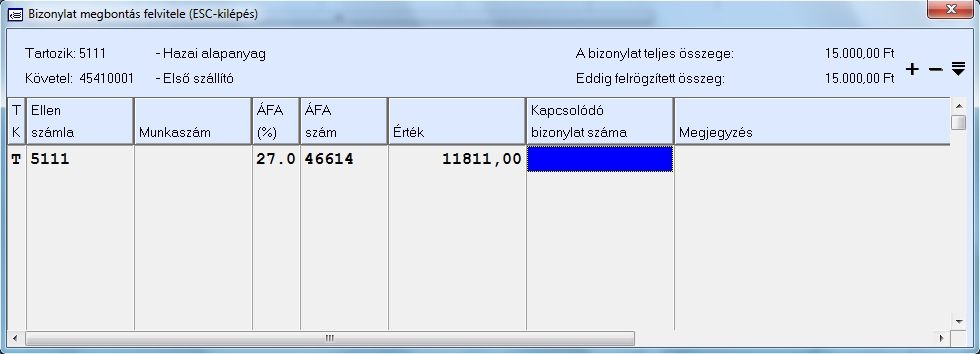 A könyvelési ablak fejrészben tudjuk legelőször megadni azt hogy a főszámla a tartozik vagy követel oldalára szeretnénk az első tételt rögzíteni, majd ezután beírhatjuk vagy kiválaszthatjuk az F10 gomb segítségével a folyószámláját, majd megadhatjuk a bizonylatszámot, a könyvelt hónapon belüli napot és a teljesítés dátumát, valamint az esedékesség dátumát. A bruttó érték mezőbe írjuk be a számla vagy tétel teljes értékét és ekkor automatikusan átkerülünk az alsó táblázatba ahol a bizonylat megbontását vihetjük fel. A bruttó érték mezőt üresen is hagyhatjuk, és akkor később kitöltődik. Ebben az esetben a jobb felső sarokban található "Ellenoldal" nevű gombra kattintva is megkezdhető a bizonylat megbontásának felvitele.A bizonylat megbontás (ellenoldal) ablakban adjuk meg a fejrészben megadott főszámla ellen oldalát (ha a főszámla tartozik, akkor itt a követelt adhatjuk meg és ellenkezőleg, ha a főszámla követel, akkor ide a tartozik oldalon álló számlaszámot várja a rendszer). A T/K oszlopban azt állíthatjuk át hogy az ellenszámla a Tartozik vagy Követel oldalra kerüljön. Értelemszerűen ha átállítjuk az alsó táblázatban Tartozik-ra az ellenszámlát , akkor a főszámla ahhoz az egy tételhez átáll Követel-re. A táblázat tetején láthatjuk a teljes Tartozik/Követel oldal könyvelését számlaszámmal és névvel ellátva.