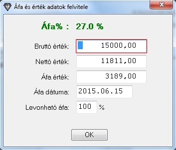 Ezután az érték megadó ablakba jutunk ahol beírhatjuk a tétel bruttó, nettó és az áfa összegét. A bruttóból a nettó automatikusan kiszámítódik. Amennyiben a bruttót nullán hagyjuk és a nettó értéket adjuk meg akkor abból a bruttó és az áfa visszaszámolódik. Ezen felül megadhatjuk a levonható áfa mértékét százalékban.
