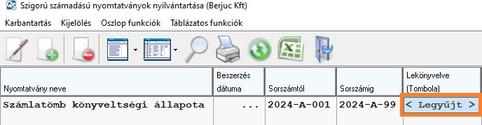 Ezt a Listázások\Számlatömb könyveltségi állapota menüpontban tehetjük meg, itt a  gomb segítségével vehetjük fel,  gomb segítségével törölhetjük és a  gomb segítségével módosíthatjuk a felvett nyomtatványokat.