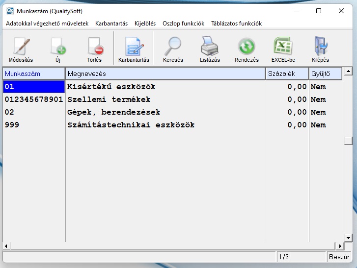 Bármelyik listán lekérdezhető, hogy egy adott munkaszámhoz melyik könyvelési tételek tartoznak. Költséghelynek is szokták nevezni, mert a leggyakrabban költségek megbontására szokták használni. Ebben a menüpontban lehet munkaszámokat felrögzíteni, a munkaszámmal és a megnevezéssel. A felrögzítés gombbal, a törlés a