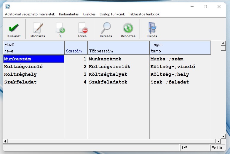 A menüpontban az először megjelenő táblázatban a munkaszámok neveit adhatjuk meg. Tetszőleges módon nevezhetjük el ezeket, maximum 4-et vihetünk fel (Professional verzió esetén, egyébként csak 1-et). Ezután a könyvelésbe annyi munkaszámos mezőt fogunk látni, ahányat felvettünk ide. Mindegyik általunk felvett sort karbantarthatjuk, ha az ablak bal felső sarkában található 'Kiválaszt' gombra kattintunk. Ekkor felvehetjük az adott munkaszámhoz tartozó sorokat, ezekből lehet majd választani.