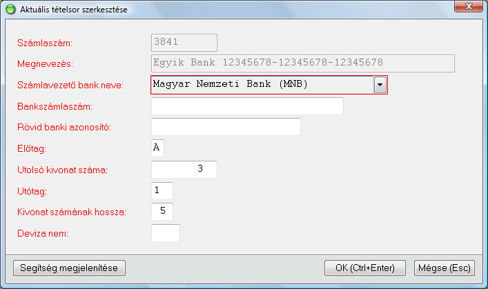 A bankszámlaszám vagy egyes bankok esetében a rövid banki azonosító alapján képes a rendszer a banki importálásnál felismerni a bank főkönyvi számát. Szintén itt van jelentősége az előtagnak, az utolsó kivonat számának, az utótagnak és a kivonat számára vonatkozó hossznak, ha automatikus bizonylatszám generálás van (számlatörtének importálásánál fordul elő ilyen). A bizonylatszám generálásról bővebben itt olvashat: Banki importálás közben bizonylatszám generálás