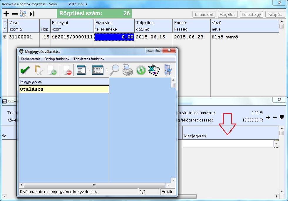 Könyvelés közben a előre felvitt megjegyzésekből a kívánt megjegyzést az alábontás során tudjuk kiválasztani a megjegyzés oszlopon állva az "F10" gomb használatával.