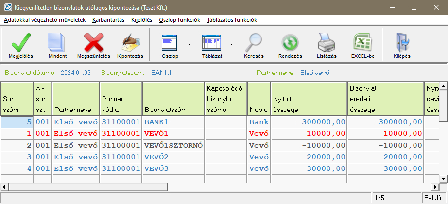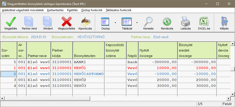 Például az alábbi képen látható VEVŐ1, VEVŐ2 és VEVŐ3 bizonylatokat a kipontozás naplóban kiegyenlíti a program a 3899-cel szemben, és egy a könyvelési tétel megkapja az O24/000001-es bizonylatszámot. A -300.000Ft-os banki sorban a 31100001-es ellenszámlát lecseréli a program 3899-re, és a kapcsolódó bizonylatszámba beírja az O24/000001-es bizonylatszámot. A sor értékét átírja 60.000Ft-ra, és generál egy újabb banki sort a maradék összeggel, 240.000Ft-al (itt 31100001 marad az ellenszámla).