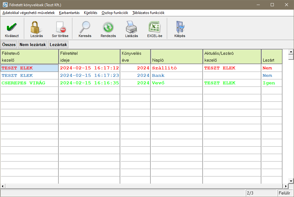 A táblázatból csak a lezárt, vagyis zöld sorok törölhetők. A "Lezárás" ikonnal vagy az F5 billentyűvel le lehet zárni a félretett könyveléseket.