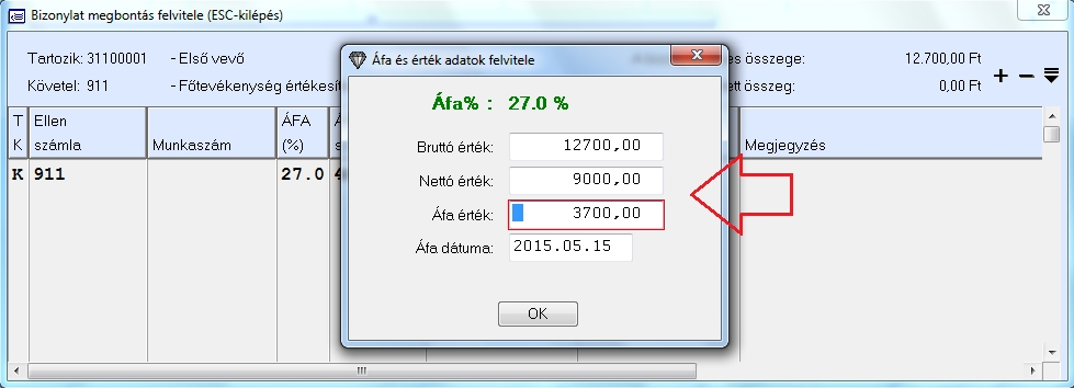 Miután meg adtuk az felső táblázatban minden adatot és a bruttó értéket a megszokottnak megfelelően a programunk át lép a kontírozási ablakba ahol megadhatjuk a számla többi adatát (Ellenszámla, ÁFA százalék stb..), majd az alábontás érték mezőjénél a felugró érték ablakban írjuk át a hibás nettó értéket. Esetünkben ez a 10.000 Ft helyett csak 9.000 Ft lett. Miután átírtuk a programunk a több értéket átszámolja a megadott bruttó adathoz. A hibás nettó értéket átírva a bruttó érték marad és ezáltal feltudtuk vinni és rögzíteni a hibásan kiállított számlát.