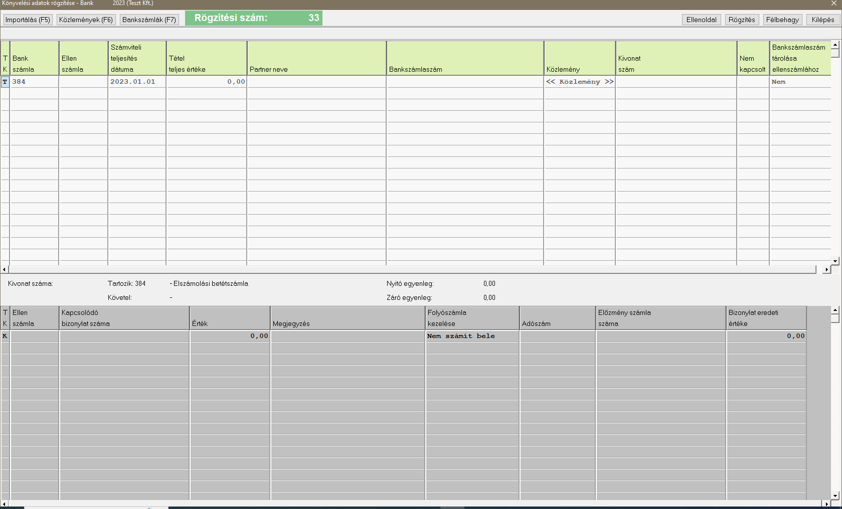 Miután végzett a rendszer az állomány feldolgozásával ki kell tölteni az esetlegesen hiányzó ellenszámlákat. Ha itt partnert ad meg (akár a fejben, akár az ellenoldalon), és csak egy alábontása van a tételnek, valamint a program felismer a közleményben egy hivatkozott bizonylatszámot (ami előírásként le is van könyvelve, de még nincs kiegyenlítve), akkor automatikusan kipontozza azt. A rendszer jelenleg csak egy kapcsolódó bizonylatszám felismerésére képes a közleményből, de ennek sikere nem garantált. Azt a karaktersorozatot fogja kapcsolódó bizonylatként kezelni a program, amiben elsőként talál egy számot.
