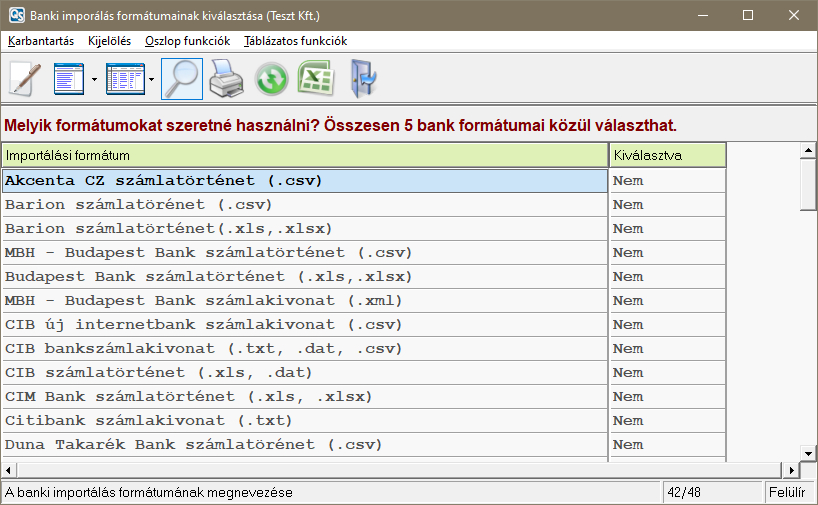 A banki importálás a "Könyvelés/Banki import állomány beolvasása" menüponttal indítható. Ha korlátozva van a használható bankok import fájltípusainak száma (mert 1, 2, 3 vagy 4 bank import formátumát vásárolta meg), akkor az első induláskor egy választó ablak jelenik meg, amiben meg kell jelölni, hogy melyik bankok formátumait szeretné használni.