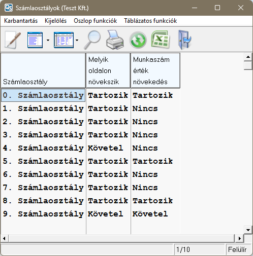 A számlaosztályokat az "Egyéb/Rendszer karbantartás/Számlaosztályok" menüpontban lehet elérni. A táblázatban nem lehet sorokat felvenni vagy törölni, de munkaszám modul használata esetén megadható a "Munkaszám érték növekedés", mely meghatározza, hogy melyik oldalon pozitív az adott számlaszám. Tehát például az 5-ös számlaosztály esetén Tartozik-ra kell beállítani a mező értékét, mert ekkor Tartozik esetén lesz pozitív, Követel esetén negatív. Ezt a mezőt csak 0, 5, 8 és 9 számlaosztály esetében lehet módosítani.
