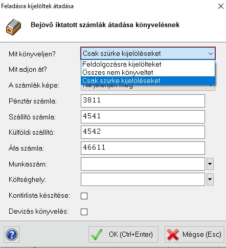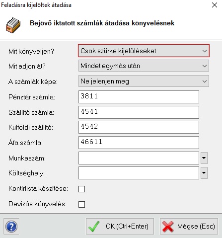 A Mit könyveljen?-el azt állíthatjuk, hogy csak a kijelölt számlákat vagy mindegyik le nem könyveltet adjuk-e át.