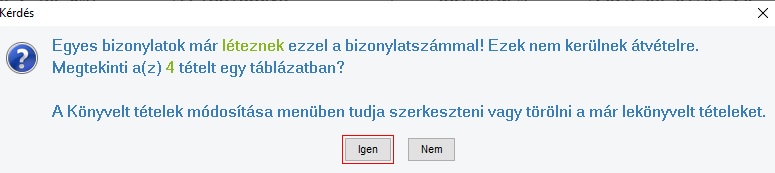 Abban az esetben ha olyan sor kerül átadásra, mely már könyvelésre került, akkor a program az átadáskor figyelmeztetést ír ki, hogy van olyan tétel ami már könyvelve van. Ezeket a tételeket ki is lehet listáztatni a programmal ha az "Igen" gombra klikkel.