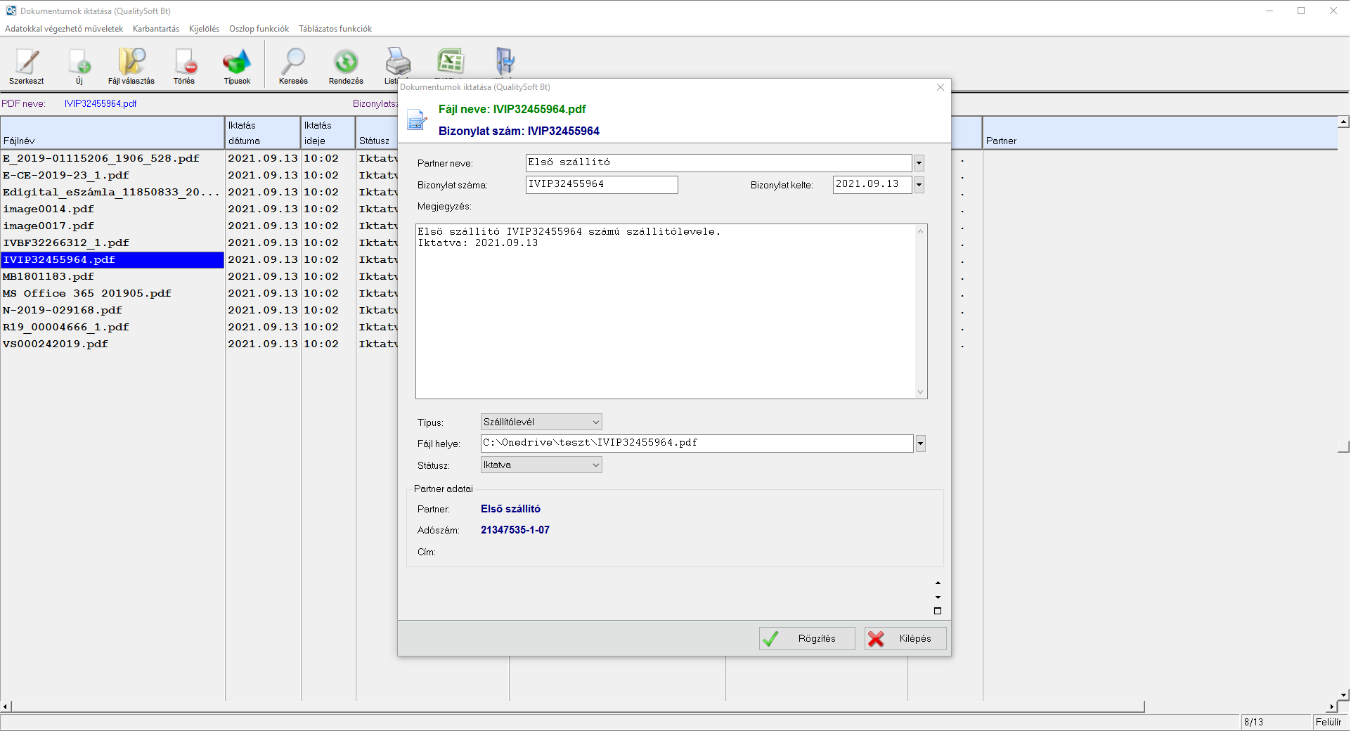 Egy dokumentumhoz választhatunk partnert, beírhatjuk a bizonylat számot és keltét valamint fűzhetünk hozzá egy bármilyen hosszúságú leírást is.