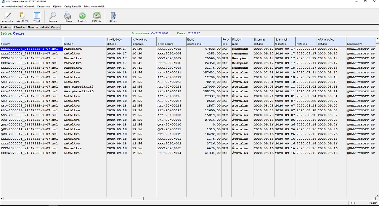 Amikor párosítunk egy számlát a hozzá tartozó NAV adatokkal, akkor a számla státusza a ‘Feldolgozvára’ változik, a külön NAV iktatóban pedig ‘Párosítvára’ áll át. Így láthatjuk, hogy mely iktatott számla lett már feldolgozva, illetve azt is, hogy mely NAV XML lett már párosítva a hozzá tartozó számlával.
