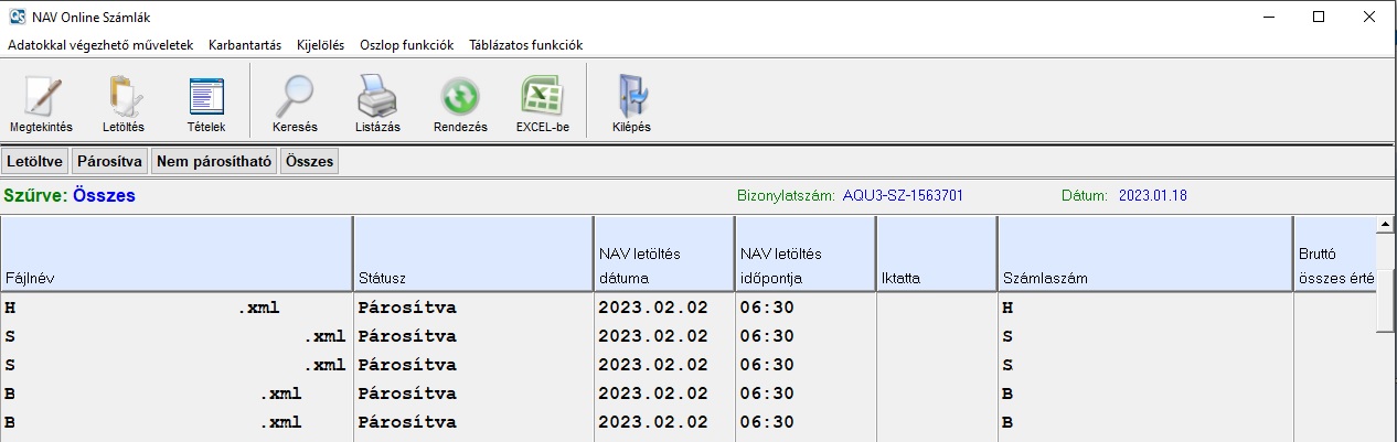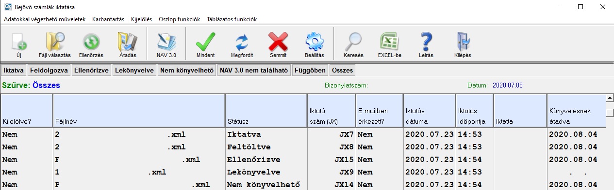 Érdemes még tudni, ha korábban a hagyományos NAV iktatót használták és nincs tétel elrejtés beállítva (például a már lekönyvelt tételek elrejtése), akkor ezek a korábban lekért xml-ek is láthatóak lesznek a PDF-ek mellett.