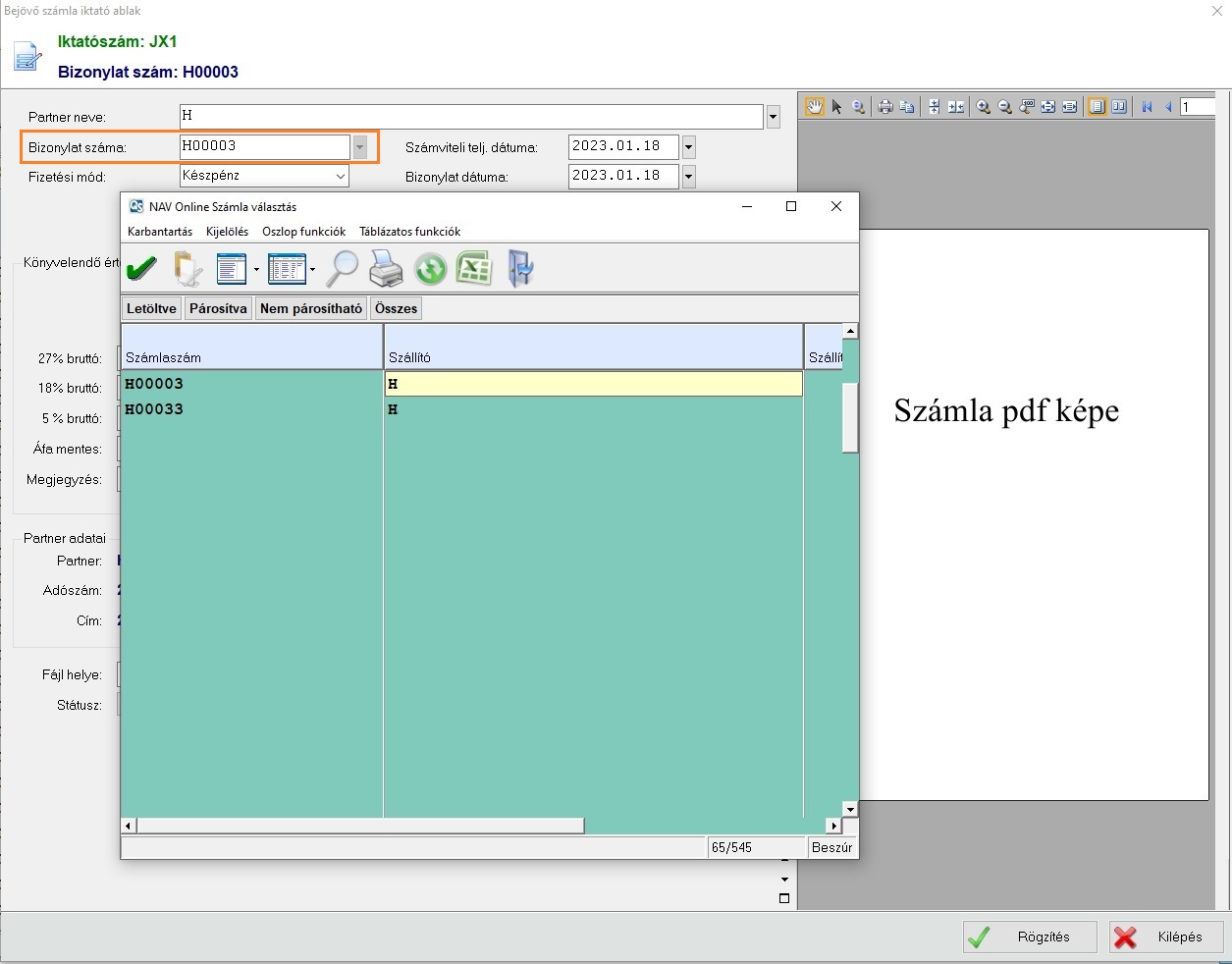 amiből kiválasztható a PDF-hez tartozó NAV-tól lekért számlaadat (xml) a bizonylatszámra vagy a partnerre történő kereséssel és ENTER nyomásával.