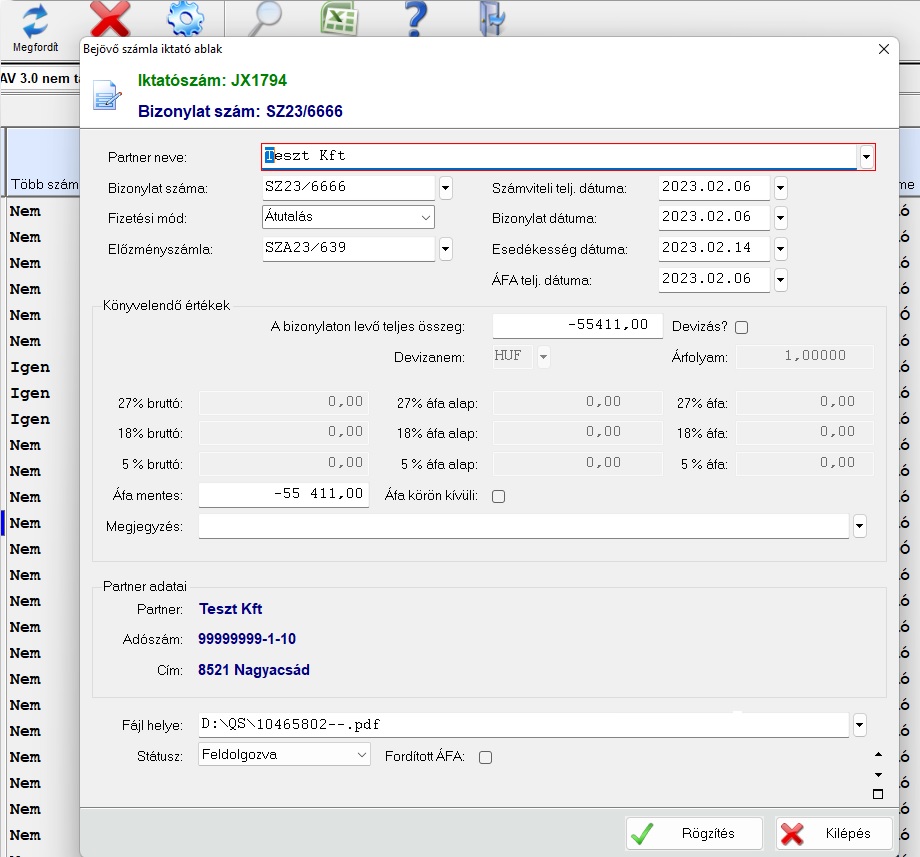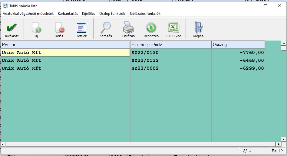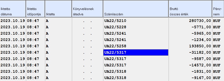 Az ilyen számlák esetében az iktatóban 1 sorban fog a számla megjelenni és a „Több számla?” oszlop Igenen áll. Ezen vagy a „Kapcsolódó bizonylat” oszlopon enterezve egy táblázatban megnézhetjük, hogy az adott bizonylatszámhoz mely más számlák tartoznak. Itt ha kiválasztunk egyet, akkor az iktató ablakon lesz megjelenítve. Ha be van kapcsolva a számlakép generálás, akkor ezekhez a számlákhoz is egyesével generálódnak pdf-ek.