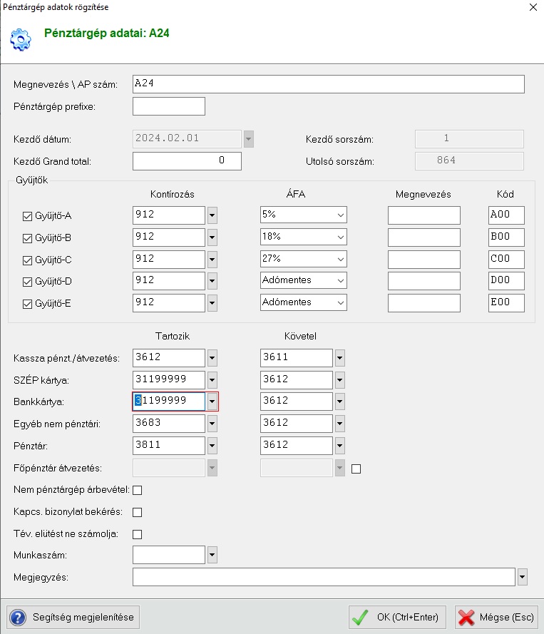 A gyűjtő mezők előtt látható egy pipálós mező. Amelyik gyűjtőt használni szeretnénk, azt ki kell pipálni. A többi nem fog látszódni a táblázatban és a nyomtatásban sem. A kontírozás mezőkbe egy főkönyvi számot kell választani, majd meg kell adnunk a gyűjtő áfáját. Ha szeretnénk ezeknek egyedi címet adni, akkor a Megnevezés mezőt kell kitölteni. Ha nem adunk meg akkor a Gyűjtő-A,Gyűjtő-B stb lesz az alapértelmezett. Ha szeretnénk a NAV Online Pénztárgépnaplót használni, akkor a Kód mező kitöltése is szükséges. Ennek beállításáról ebben a cikkben olvashat.