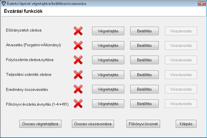 Ezt a lépés azonban az évzárás előtt mindenképpen meg kell tenni. Programunkban az évzárás lépésenként külön és egy gombnyomással is elvégezhető. Ehhez a "Zárás-nyitás/Évzárás, évnyitás funkciók/Évzárás, évnyitás lépésről lépésre" menüpontot kell elindítania. Ekkor az alábbi ablak jelenik meg.