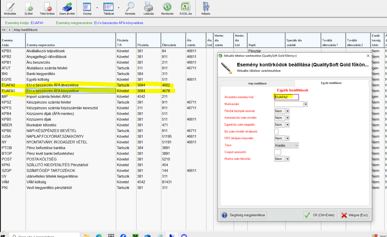 A könyvelés/eseménykönyvelés menüpontban az EUAFA1-es eseményt kiválasztva azonnal könyvelhetjük egy menetben az áfa sort.
