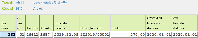 Következő évbe automatikusan lekönyvelődik a bizonylat áfa tartalma a vegyes naplóba az átvezetési számláról.