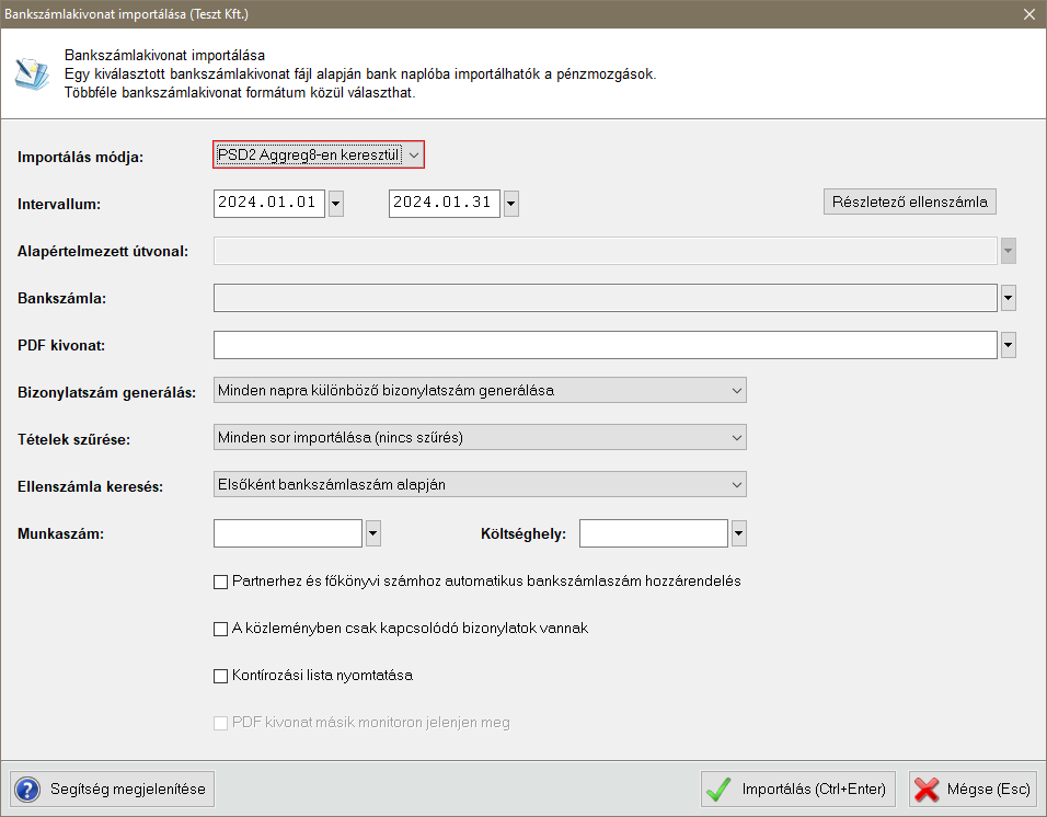 Az importálást a ’Könyvelés\Banki import állomány beolvasása’ menüpontban tudjuk megtenni. Kattintsunk az importálás gombra, majd az ’Importálás módja’ lehetőségnél válasszuk a ’PSD2 Agreg8-en keresztül’. Az ’Intervallum’ mezőkben adjuk meg a lekérni kívánt időszakot, majd a ’Bankszámla’ ablakban válasszuk ki melyik bankszámlát szeretnénk használni. Az ablakban csak az aktuális cégben felvitt bankszámlaszámok közül választhatunk. Ha mindent megfelelően beállítottunk, az ’Importálás (Ctrl-Enter)’ gombbal elindíthatjuk az importálást. Ezután már mindent a megszokott módon kell tennünk, ugyanúgy mint a többi bank importálásnál. Banktól függően 120 vagy 90 napra visszamenőleg van lehetőség a tranzakciótörténet lekérdezésére.