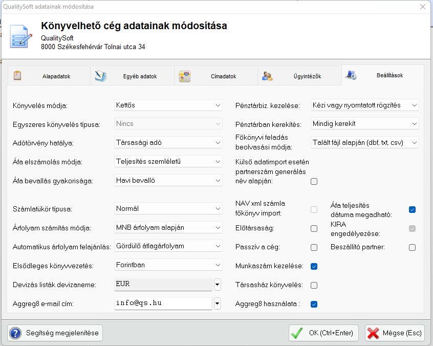 A ‘Karbantartás\Könyvelhető cégek karbantartása’ menüpontban az adott cégen állva a ’Beállítások’ fülön található az ’Aggreg8 használata mező. Ezt pipáljuk be azokban a cégekben amelyekben a funkciót használni szeretnénk. Csak annyi cégben pipálhatja ezt be, ahányra korábban megvásárolta! Az ’Aggreg8 e-mail cím’ mezőbe kell írnunk a használni kívánt e-mail címet. Itt érdemes egy olyan e-mail címet használni amelyhez az ügyfélnek is van hozzáférése, mivel a hozzájárulást 180 naponta meg kell újítani.  Utána a mező végén található nyíl vagy az F10 megnyomásával megnyithatjuk a bankszámlák listája ablakot. Ebben az ablakban láthatjuk az adott cégben felvett összes bankszámlát.