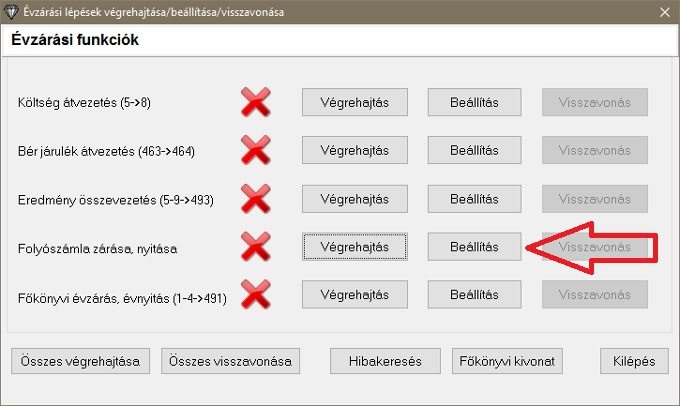 Ezen az ablakon a "Beállítás" gombra kattintva tudjuk beállítani folyószámla zárás adatait. Itt adhatjuk meg az évzárás (göngyölítés) dátumát, vevő és szállító főszámlákat amik alábontásait zárja (belföldi és külföldi) és a zárás módját.