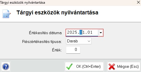 Ekkor egy adatbeviteliablak nyílik meg, ahol megadhatja a dátumot, a részértékesítés típusát (Darab vagy Százalék) és az értéket. Az adatok kitöltése után, kattintson az „OK” gombra. Ezt követően rögzülni fog a az eszköz kartonjára a részeladás.
