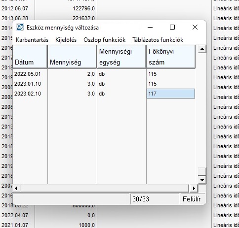 Az eszközök mennyiség változásának tárolása csak a 2022.09.21. vagy annál frissebb programverzióban érhető el. A főkönyvi szám változás 2023.03.01 vagy annál frissebb verzióban található meg. Az ennél korábbi változások nem kerültek eltárolásra, ezeket kézzel kell hozzáadni ha szükséges. Csak annyit kell tennünk, hogy az Eszközök mennyiségének változása menüben egy plusz (+) billentyűt nyomunk és felvisszük a megfelelő mennyiséget és dátumot valamint a főkönyvi számot. Ha az utoljára megadott darabszám nem egyezik az eszköz mellé beírt számmal, akkor a program figyelmeztet és megkérdezi, hogy szeretné-e korrigálni. Ezt szintén felajánlja a főkönyvi szám esetében.
