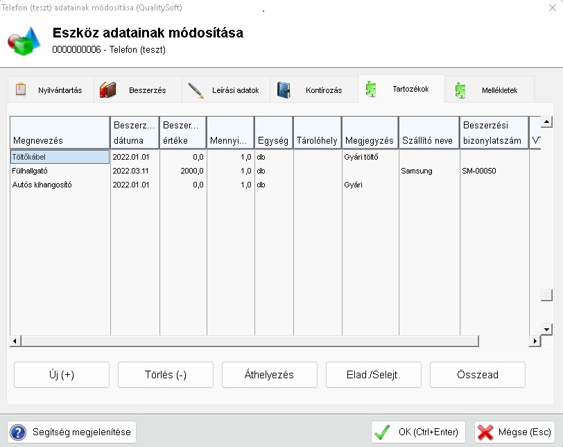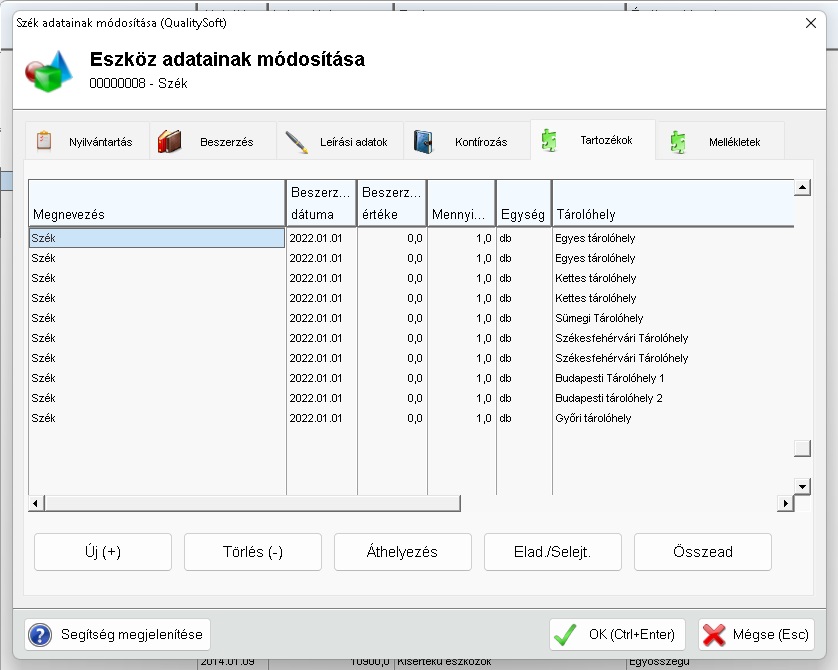 A második kezelési módszert akkor érdemes használni, ha egy eszköz mennyiségéhez egy 1-nél nagyobb számot adtunk meg és ezeket darabonként külön tárolóhelyen szeretnénk tárolni, valamint a leltáríven is megjelenítenénk, de egy nyilvántartási számon és az értékcsökkenést továbbra is közösen számolnánk hozzá. Ekkor az eszközt annyiszor vesszük fel a tartozékok közé, ahány darab van belőle. Tehát ha felveszünk egy Szék nevű eszközt a 00000008 nyilvántartási számon (lásd a képen) aminek a darabszáma 10, akkor a tartozékok közé tízszer kell felvennünk az eszközt és mindegyiknél a külön tárolóhelyet megadva. Ha az egyik darabot egy másik tárolóhelyre mozgatjuk, akkor az Áthelyezés gombbal ezt egyszerűen megtehetjük. Az értékcsökkenés elszámolása itt is egyszerre, egyben történik az eszközre, a tartozékokat figyelmen kívül hagyva. Ez csak a különböző tárolóhelyeken való nyilvántartásra szolgál. Ha az eszköz mellé beírt mennyiség nem egyezik a tartozékok összmennyiségével, akkor az Összead gombbal átírhatjuk az eszköz mennyiségét a tartozékokéra.