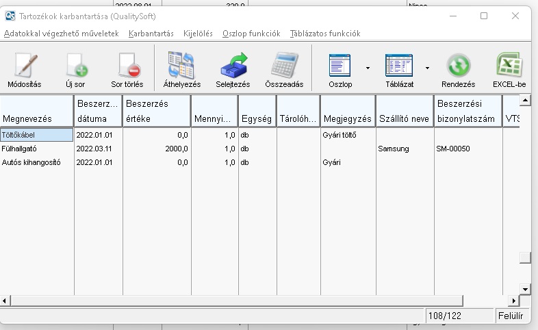Az első, hogy egyszerűen felvesszük az adott eszköz tartozékait. Ilyenkor a tárgyieszközhöz kapcsolódó, de mégis külön eszközöket veszünk fel. Ezeknek a listáját a 476-os rendszerparaméter bekapcsolásával tudjuk megjeleníteni a Karton nyomtatványon ha szeretnénk. Az értékcsökkenés elszámolása nem veszi figyelembe a tartozékokat! Az mindig csak az eszközként felvett sorokat nézi.